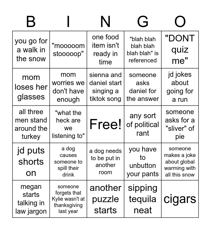 This bingo card has a free space and 24 words: a dog causes someone to spill their drink, someone forgets that Kylie wasn't at thanksgiving last year, sienna and daniel start singing a tiktok song, megan starts talking in law jargon, "DONT quiz me", you go for a walk in the snow, mom loses her glasses, "mooooom stooooop", any sort of political rant, a dog needs to be put in another room, someone asks daniel for the answer, all three men stand around the turkey, you have to unbutton your pants, someone makes a joke about global warming with all this snow, mom worries we don't have enough, sipping tequila neat, someone asks for a "sliver" of pie, one food item isn't ready in time, jd jokes about going for a run, "what the heck are we listening to", cigars, jd puts shorts on, "blah blah blah blah blah blah" is referenced and another puzzle starts.