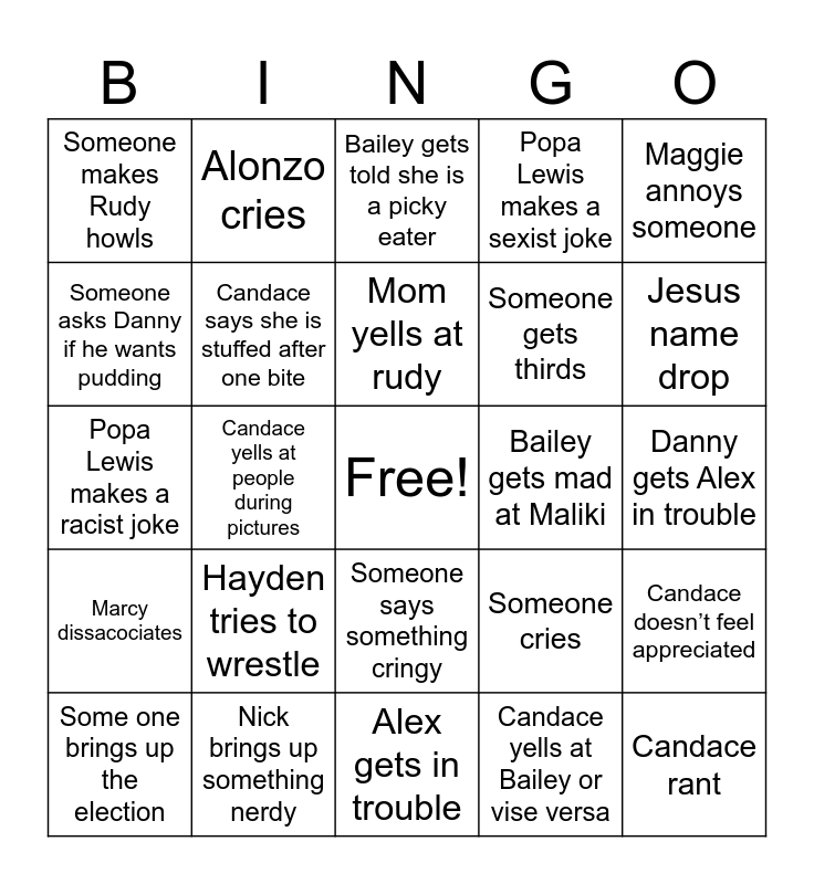 This bingo card has a free space and 24 words: Some one brings up the election, Hayden tries to wrestle, Mom yells at rudy, Candace yells at Bailey or vise versa, Maggie annoys someone, Someone makes Rudy howls, Alonzo cries, Bailey gets told she is a picky eater, Bailey gets mad at Maliki, Danny gets Alex in trouble, Popa Lewis makes a racist joke, Candace says she is stuffed after one bite, Someone cries, Candace doesn’t feel appreciated, Someone asks Danny if he wants pudding, Nick brings up something nerdy, Alex gets in trouble, Popa Lewis makes a sexist joke, Jesus name drop, Marcy dissacociates, Candace yells at people during pictures, Someone says something cringy, Someone gets thirds and Candace rant.