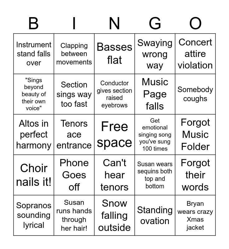 This bingo card has a free space and 24 words: Phone Goes off, Susan runs hands through her hair!, Conductor gives section raised eyebrows, Sopranos sounding lyrical, Concert attire violation, Instrument stand falls over, "Sings beyond beauty of their own voice", Clapping between movements, Get emotional singing song you've sung 100 times, Can't hear tenors, Music Page falls, Altos in perfect harmony, Susan wears sequins both top and bottom, Forgot their words, Section sings way too fast, Standing ovation, Forgot Music Folder, Basses flat, Somebody coughs, Tenors ace entrance, Bryan wears crazy Xmas jacket, Choir nails it!, Swaying wrong way and Snow falling outside.