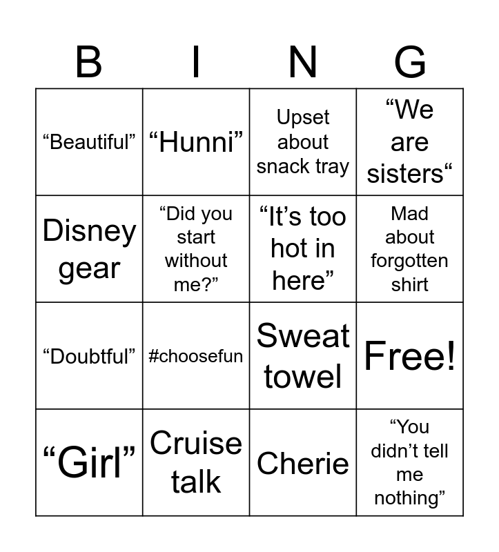 This bingo card has 20 words: Free!, Upset about bingo, Upset about snack tray, “Jan”, “Girl”, Disney gear, Cruise talk, “Beautiful”, “Doubtful”, “Hunni”, #choosefun, Sweat towel, “Did you start without me?”, “You didn’t tell me nothing”, “It’s too hot in here”, “I have to go outside”, Mad about forgotten shirt, “We are sisters“, Cherie and ARE WE GOIng to smoke.