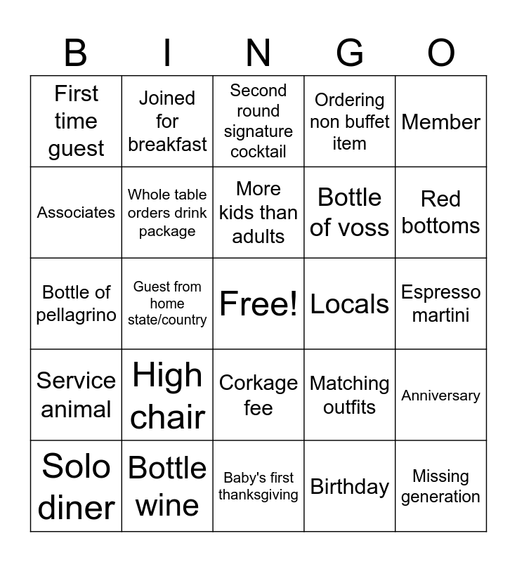 This bingo card has a free space and 24 words: High chair, Bottle wine, More kids than adults, Solo diner, Member, First time guest, Associates, Joined for breakfast, Locals, Corkage fee, Bottle of voss, Bottle of pellagrino, Matching outfits, Anniversary, Whole table orders drink package, Birthday, Espresso martini, Second round signature cocktail, Red bottoms, Guest from home state/country, Missing generation, Service animal, Ordering non buffet item and Baby's first thanksgiving.