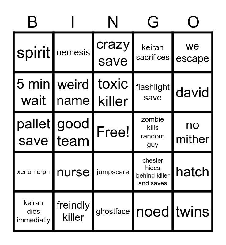 This bingo card has a free space and 24 words: nurse, freindly killer, toxic killer, keiran dies immediatly, we escape, spirit, 5 min wait, nemesis, zombie kills random guy, jumpscare, flashlight save, pallet save, chester hides behind killer and saves, hatch, weird name, noed, no mither, crazy save, david, good team, twins, xenomorph, keiran sacrifices and ghostface.