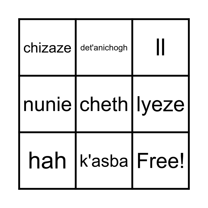 This bingo card has 16 words: gah, ejere, ll, chizaze, Free!, det'anichogh, sas, lichogh, cheth, lyeze, nagidhl, nunie, tsa, k'asba, hah and denie.