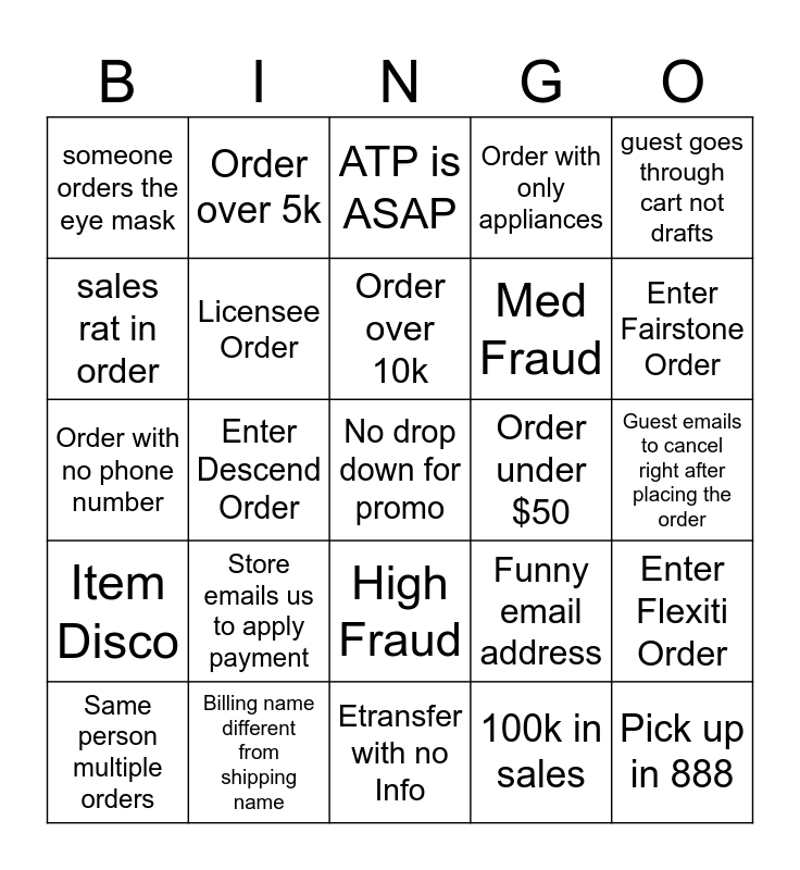 This bingo card has 25 words: Store emails us to apply payment, Etransfer with no Info, Order over 10k, Same person multiple orders, guest goes through cart not drafts, someone orders the eye mask, sales rat in order, Order over 5k, Order under $50, High Fraud, Med Fraud, Order with no phone number, Funny email address, Enter Flexiti Order, Licensee Order, Pick up in 888, Guest emails to cancel right after placing the order, ATP is ASAP, Enter Fairstone Order, Enter Descend Order, No drop down for promo, Billing name different from shipping name, Item Disco, Order with only appliances and 100k in sales.