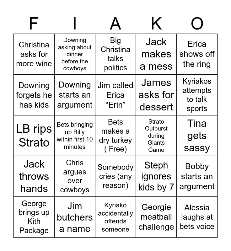 This bingo card has a free space and 32 words: Georgie meatball challenge, Mia saying not to bring up football, Bets bringing up Billy within first 10 minutes, LB uses the LB voice, Jack throws hands, Downing starts an argument, Erica shows off the ring, Bobby starts an argument, Downing asking about dinner before the cowboys, Theo Chris mispronouncing player name, Jim called Erica “Erin”, Big Christina talks politics, Penelope brings up TSwift, Theo Chris talks 49ers, Strato Outburst during Giants Game, Theo Chris “Gucci Goon”, George brings up Kith Package, LB rips Strato, Somebody cries (any reason), Chris argues over cowboys, Steph ignores kids by 7, Kosta enters house angry, Tina gets sassy, Jim butchers a name, Alessia laughs at bets voice, Jack makes a mess, James asks for dessert, Downing forgets he has kids, Christina asks for more wine, Kyriako accidentally offends someone, “That’s what she said” and Kyriakos attempts to talk sports.