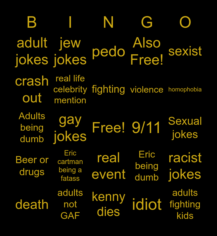 This bingo card has a free space and 25 words: Eric cartman being a fatass, kenny dies, fighting, death, sexist, adult jokes, crash out, jew jokes, 9/11, real event, violence, Adults being dumb, Eric being dumb, racist jokes, real life celebrity mention, SA, Sexual jokes, pedo, homophobia, gay jokes, adults fighting kids, adults not GAF, Beer or drugs, Also Free! and idiot.