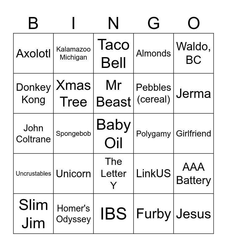 This bingo card has a free space and 24 words: Unicorn, Homer's Odyssey, Mr Beast, Slim Jim, Waldo, BC, Axolotl, Donkey Kong, Kalamazoo Michigan, Polygamy, The Letter Y, Pebbles (cereal), John Coltrane, LinkUS, AAA Battery, Xmas Tree, Furby, Girlfriend, Taco Bell, Jerma, Spongebob, Jesus, Uncrustables, Almonds and IBS.