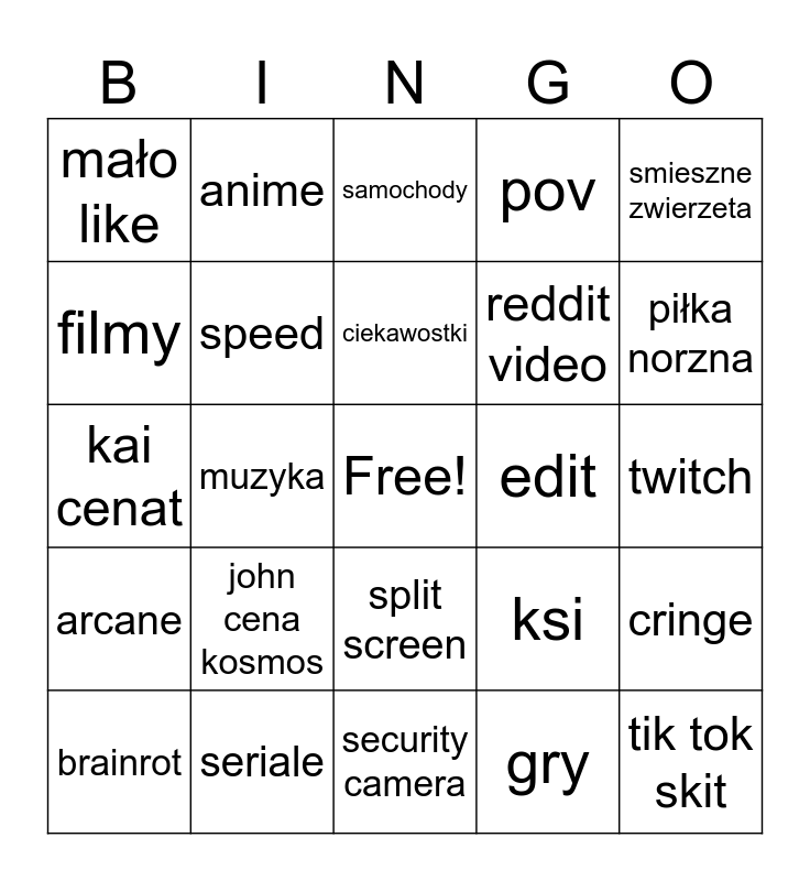 This bingo card has a free space and 24 words: brainrot, john cena kosmos, ciekawostki, gry, smieszne zwierzeta, mało like, anime, samochody, edit, twitch, kai cenat, speed, ksi, cringe, filmy, seriale, security camera, pov, piłka norzna, arcane, muzyka, split screen, reddit video and tik tok skit.