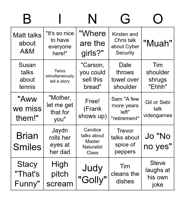 This bingo card has a free space and 39 words: "Jackie, you make the best salad", "I'm ready for a nap", Bronwyn "My Lanta", Twins simultaneously tell a story, Stacy "That's Funny", Candice talks about Master Naturalist Class, "Carson, you could sell this bread", F BOMB dropped X10, "Muah", Brian Smiles, "Mother, let me get that for you", Kirsten and Chris talk about Cyber Security, Steve laughs at his own joke, Gil or Sebi talk videogames, Sam "A few more years left" *retirement*, Jaydn rolls her eyes at her dad, Mema "Handsome", Matt talks about A&M, Devon interviews someone, Trevor talks about spice of peppers, Susan talks about tennis, Judy "Golly", Dale throws towel over shoulder, Tim shoulder shrugs "Ehhh", "Who wants leftovers?", "Who made the ____? It is so good!", "Can I get the recipe for____?", "While you're up, could you...", "How was the race?", "It's so nice to have everyone here!", "How'd you sleep last night?", "How was the drive?", "Where are the girls?", High pitch scream, Tim cleans the dishes, "Anyone want to get in the hot tub?", Jo "No no yes", "Aww we miss them!" and "What's Hunter doing today?".