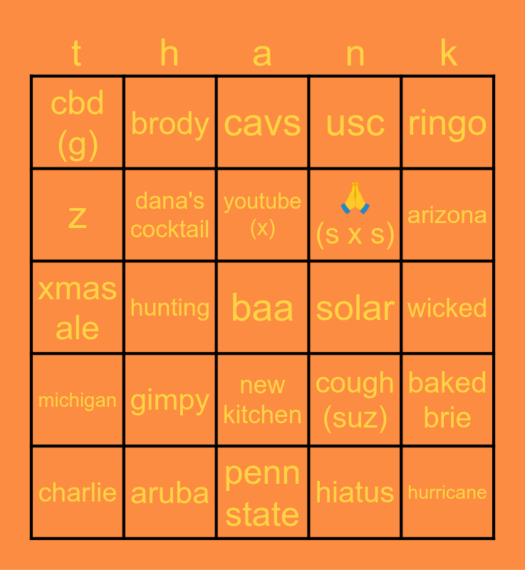 This bingo card has a free space and 24 words: gimpy, aruba, youtube (x), charlie, ringo, cbd (g), z, brody, solar, new kitchen, 🙏 (s x s), xmas ale, cough (suz), baked brie, dana's cocktail, hiatus, wicked, cavs, arizona, hunting, hurricane, michigan, usc and penn state.