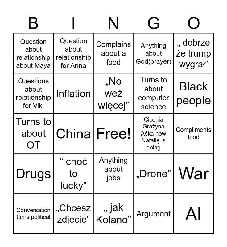This bingo card has a free space and 24 words: “ choć to lucky”, „Chcesz zdjęcie”, „No weź więcej”, Conversation turns political, „ dobrze że trump wygrał”, Question about relationship about Maya, Questions about relationship for Viki, Question about relationship for Anna, Ciconia Grażyna Aśka how Natalię is doing, Anything about jobs, Turns to about computer science, Turns to about OT, „Drone”, War, Inflation, Argument, Compliments food, Complains about a food, Black people, China, AI, Drugs, Anything about God(prayer) and „ jak Kolano”.