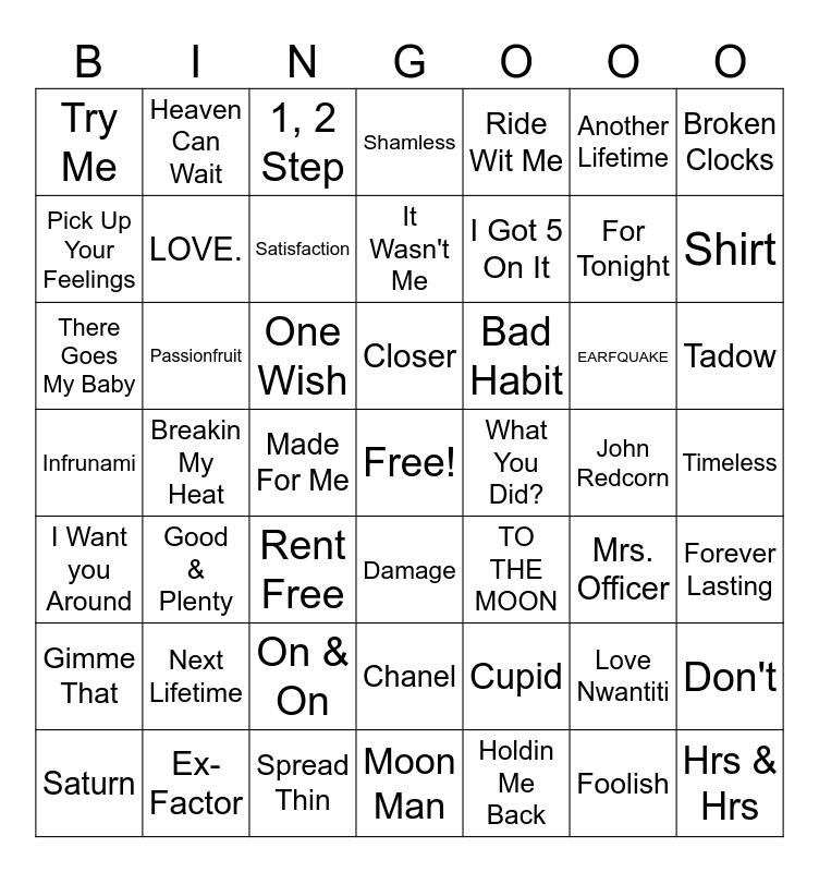 This bingo card has a free space and 103 words: Kill Bill, Saturn, Ride Wit Me, Snooze, Pretty Wings, Make Me Better, Because Of You, Mad, Are You That Somebody?, My Prerogative, My Boo, Sure Thing, Foolish, Touch My Body, We Belong Together, Gimme That, 1, 2 Step, And I, Oh, Goodies, Slow Down, Halfcrazy, Ex-Factor, Lotus Flower Bomb, Cupid, One Wish, Satisfaction, Shamless, Put Yo Gun to Use, Fool for You, Bad Habit, Made For Me, Ease Up, Moon Man, Rent Free, TO THE MOON, WAIT FOR U, Letter From Houston, Pick Up Your Feelings, Infrunami, Thinkin Bout You, Passionfruit, Good & Plenty, Another Lifetime, Love Nwantiti, Try Me, Window Seat, For Tonight, Like I Want You, Hrs & Hrs, If You Let Me, What You Did?, Timeless, What's It Gonna Be?!, Let Me Hold You, Like You, Touch, Ice Box, Miss Independent, Closer, There Goes My Baby, Go Deep, Remember The Time, Love, Candy Rain, Damage, Moonlight, Heaven Can Wait, It Wasn't Me, I Got 5 On It, Breakin My Heat, Always On Time, The Recipe, On My Mama, Don't, The Beach, Special Affair, Tadow, Holdin Me Back, Over, Drama, Spread Thin, Broken Clocks, Free Mind, Shirt, I'm Sprung, John Redcorn, Charlie, Last Name Wilson, Mrs. Officer, Pyramids, Rain, Calling My Phone, EARFQUAKE, Forever Lasting, Sink or Swim, act iii: on god?, LOVE., I Want you Around, Pink + White, Next Lifetime, On & On, Chanel and Teenage Fever.