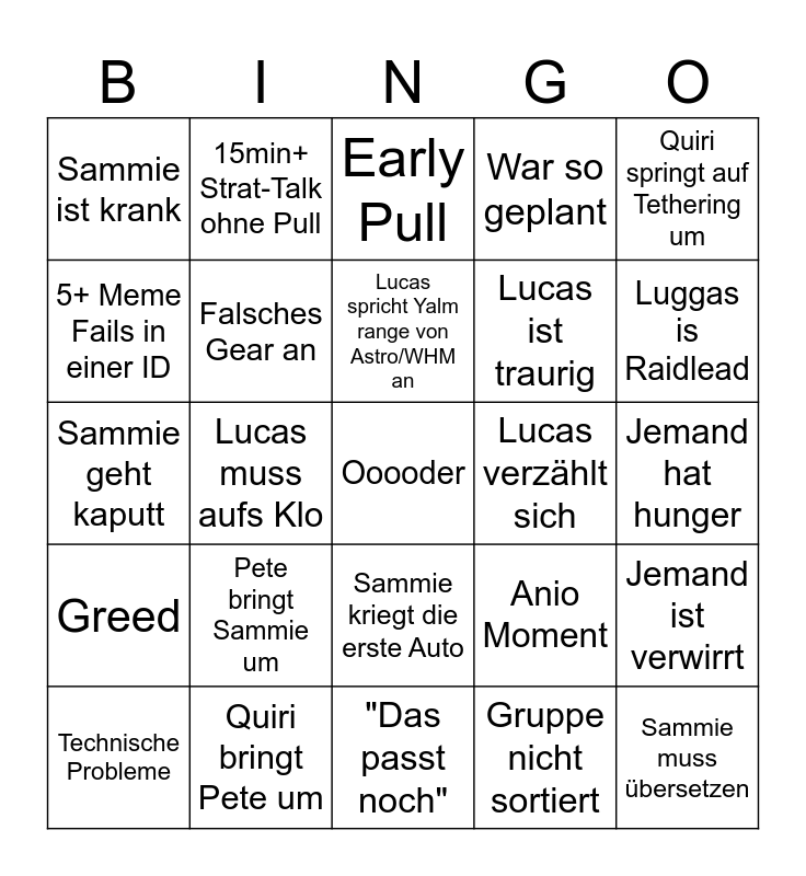 This bingo card has a free space and 24 words: Pete bringt Sammie um, Quiri bringt Pete um, Lucas spricht Yalm range von Astro/WHM an, Technische Probleme, Quiri springt auf Tethering um, Sammie ist krank, 5+ Meme Fails in einer ID, 15min+ Strat-Talk ohne Pull, Lucas verzählt sich, Sammie kriegt die erste Auto, Lucas ist traurig, Sammie geht kaputt, Anio Moment, Jemand ist verwirrt, Falsches Gear an, Gruppe nicht sortiert, Jemand hat hunger, Early Pull, Luggas is Raidlead, Lucas muss aufs Klo, Sammie muss übersetzen, Greed, War so geplant and "Das passt noch".