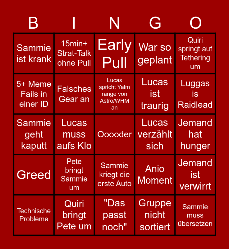 This bingo card has a free space and 24 words: Pete bringt Sammie um, Quiri bringt Pete um, Lucas spricht Yalm range von Astro/WHM an, Technische Probleme, Quiri springt auf Tethering um, Sammie ist krank, 5+ Meme Fails in einer ID, 15min+ Strat-Talk ohne Pull, Lucas verzählt sich, Sammie kriegt die erste Auto, Lucas ist traurig, Sammie geht kaputt, Anio Moment, Jemand ist verwirrt, Falsches Gear an, Gruppe nicht sortiert, Jemand hat hunger, Early Pull, Luggas is Raidlead, Lucas muss aufs Klo, Sammie muss übersetzen, Greed, War so geplant and "Das passt noch".