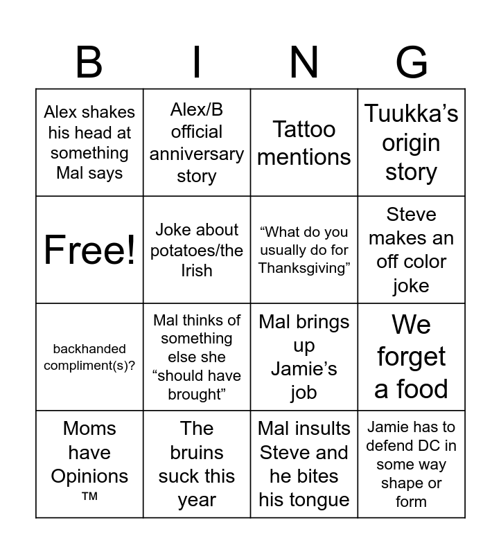 This bingo card has 16 words: The bruins suck this year, We forget a food, Tattoo mentions, Alex shakes his head at something Mal says, backhanded compliment(s)?, Alex/B official anniversary story, Mal brings up Jamie’s job, Mal insults Steve and he bites his tongue, Free!, Joke about potatoes/the Irish, Moms have Opinions ™️, Tuukka’s origin story, Mal thinks of something else she “should have brought”, Steve makes an off color joke, “What do you usually do for Thanksgiving” and Jamie has to defend DC in some way shape or form.