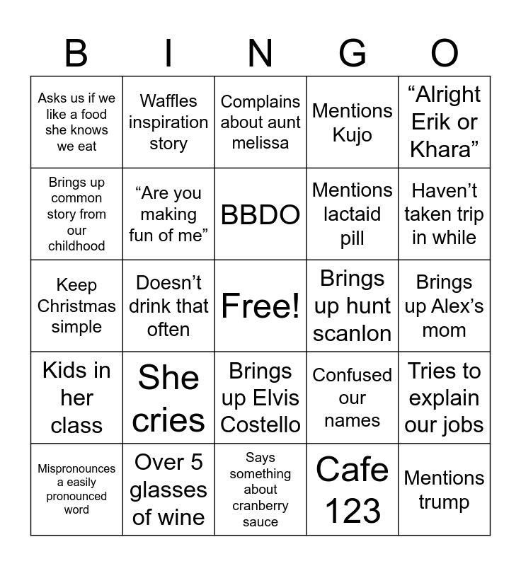 This bingo card has a free space and 24 words: She cries, Over 5 glasses of wine, BBDO, Mispronounces a easily pronounced word, “Alright Erik or Khara”, Asks us if we like a food she knows we eat, Brings up common story from our childhood, Waffles inspiration story, Brings up hunt scanlon, Brings up Elvis Costello, Mentions lactaid pill, Keep Christmas simple, Confused our names, Tries to explain our jobs, “Are you making fun of me”, Cafe 123, Brings up Alex’s mom, Complains about aunt melissa, Haven’t taken trip in while, Doesn’t drink that often, Mentions trump, Kids in her class, Mentions Kujo and Says something about cranberry sauce.