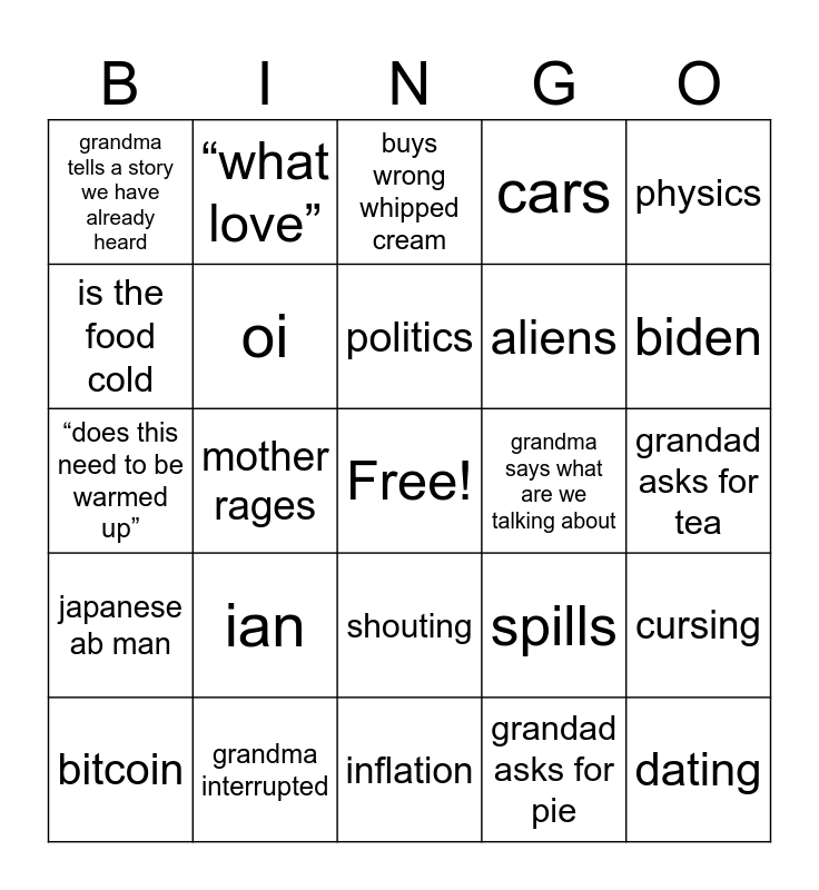 This bingo card has a free space and 24 words: ian, grandma interrupted, politics, bitcoin, physics, grandma tells a story we have already heard, is the food cold, “what love”, grandma says what are we talking about, shouting, aliens, “does this need to be warmed up”, spills, cursing, oi, grandad asks for pie, grandad asks for tea, buys wrong whipped cream, biden, mother rages, dating, japanese ab man, cars and inflation.