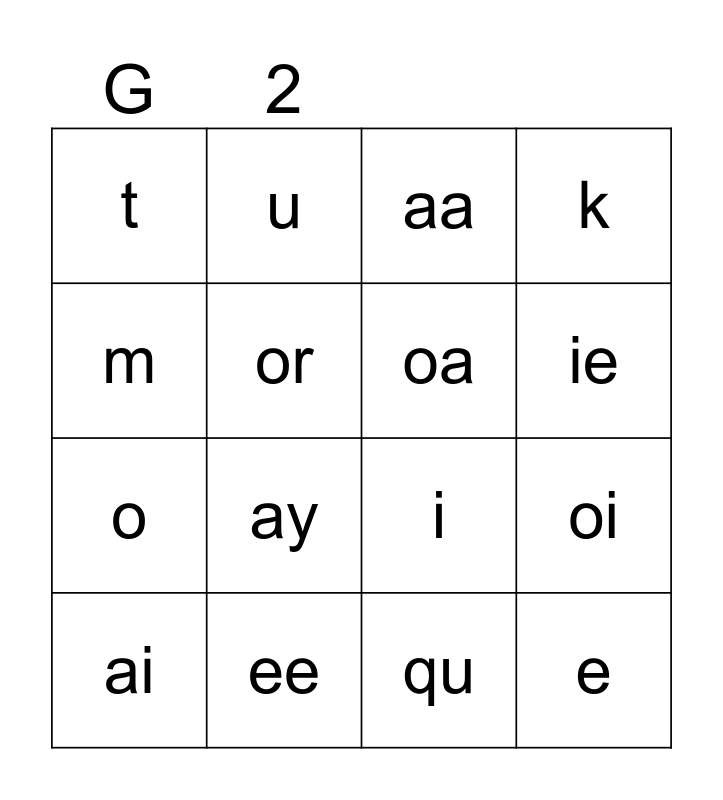 This bingo card has a free space and 15 words: ai, e, aa, t, ie, m, ay, qu, or, o, oi, k, oa, u and ee.