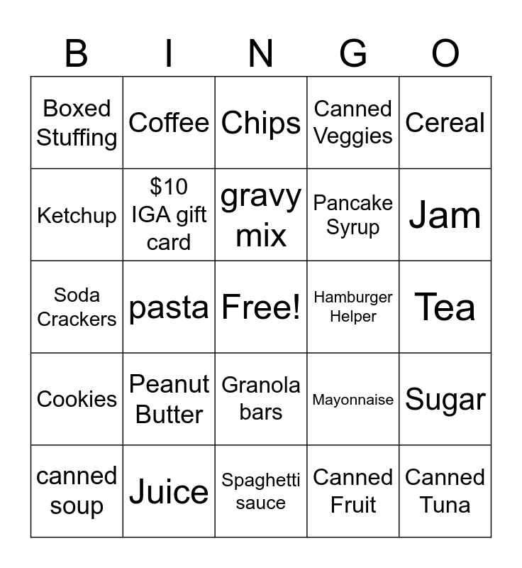 This bingo card has a free space and 24 words: Peanut Butter, Juice, gravy mix, canned soup, Cereal, Boxed Stuffing, Ketchup, Coffee, Hamburger Helper, Granola bars, Pancake Syrup, Soda Crackers, Mayonnaise, Sugar, $10 IGA gift card, Canned Fruit, Tea, Chips, Jam, pasta, Canned Tuna, Cookies, Canned Veggies and Spaghetti sauce.