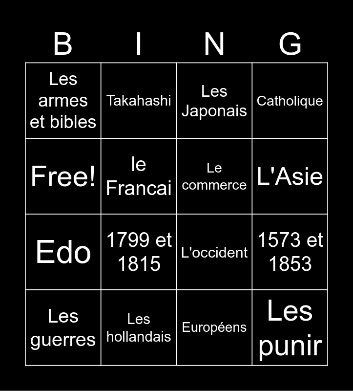 This bingo card has 18 words: Free!, Les hollandais, Les Japonais, Catholique, Edo, Takahashi, L'occident, L'Asie, Les armes et bibles, 1799 et 1815, Européens, 1573 et 1853, Les guerres, le Francai, Le commerce, Les punir, Le russie and Asiatique.