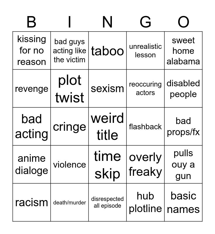 This bingo card has a free space and 24 words: violence, death/murder, sexism, racism, sweet home alabama, kissing for no reason, revenge, bad guys acting like the victim, flashback, time skip, reoccuring actors, bad acting, overly freaky, pulls ouy a gun, plot twist, hub plotline, bad props/fx, taboo, disabled people, cringe, basic names, anime dialoge, unrealistic lesson and disrespected all episode.
