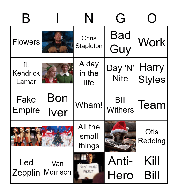 This bingo card has 6 images, a free space and 18 words: Van Morrison, A day in the life, Led Zepplin, Work, Flowers, ft. Kendrick Lamar, Bill Withers, All the small things, Day 'N' Nite, Fake Empire, Otis Redding, Anti-Hero, Team, Chris Stapleton, Harry Styles, Bon Iver, Kill Bill and Bad Guy.