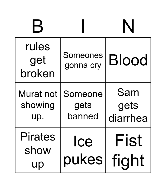 This bingo card has a free space and 8 words: Sam gets diarrhea, Blood, Someones gonna cry, Pirates show up, rules get broken, Fist fight, Murat not showing up. and Ice pukes.