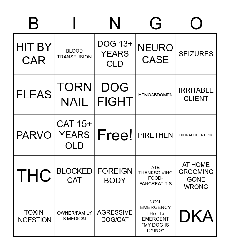 This bingo card has a free space and 24 words: BLOCKED CAT, OWNER/FAMILY IS MEDICAL, DOG FIGHT, TOXIN INGESTION, SEIZURES, HIT BY CAR, FLEAS, BLOOD TRANSFUSION, PIRETHEN, FOREIGN BODY, HEMOABDOMEN, PARVO, ATE THANKSGIVING FOOD- PANCREATITIS, AT HOME GROOMING GONE WRONG, TORN NAIL, NON-EMERGENCY THAT IS EMERGENT "MY DOG IS DYING", THORACOCENTESIS, DOG 13+ YEARS OLD, IRRITABLE CLIENT, CAT 15+ YEARS OLD, DKA, THC, NEURO CASE and AGRESSIVE DOG/CAT.