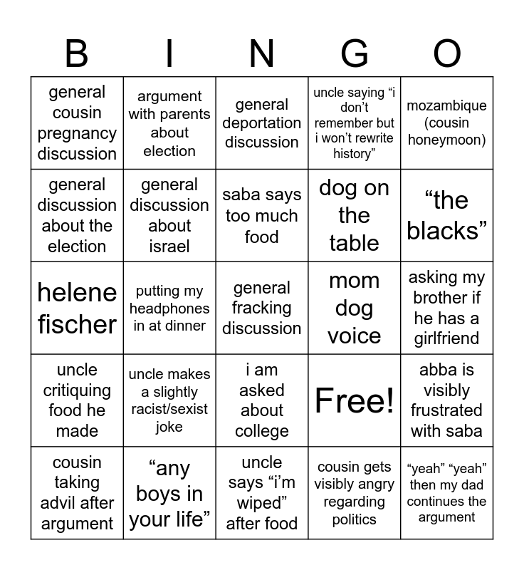 This bingo card has 25 words: uncle makes a slightly racist/sexist joke, uncle says “i’m wiped” after food, saba says too much food, cousin taking advil after argument, mozambique (cousin honeymoon), general cousin pregnancy discussion, general discussion about the election, argument with parents about election, mom dog voice, i am asked about college, dog on the table, helene fischer, Free!, abba is visibly frustrated with saba, general discussion about israel, “yeah” “yeah” then my dad continues the argument, asking my brother if he has a girlfriend, general deportation discussion, “the blacks”, putting my headphones in at dinner, general fracking discussion, “any boys in your life”, uncle critiquing food he made, uncle saying “i don’t remember but i won’t rewrite history” and cousin gets visibly angry regarding politics.