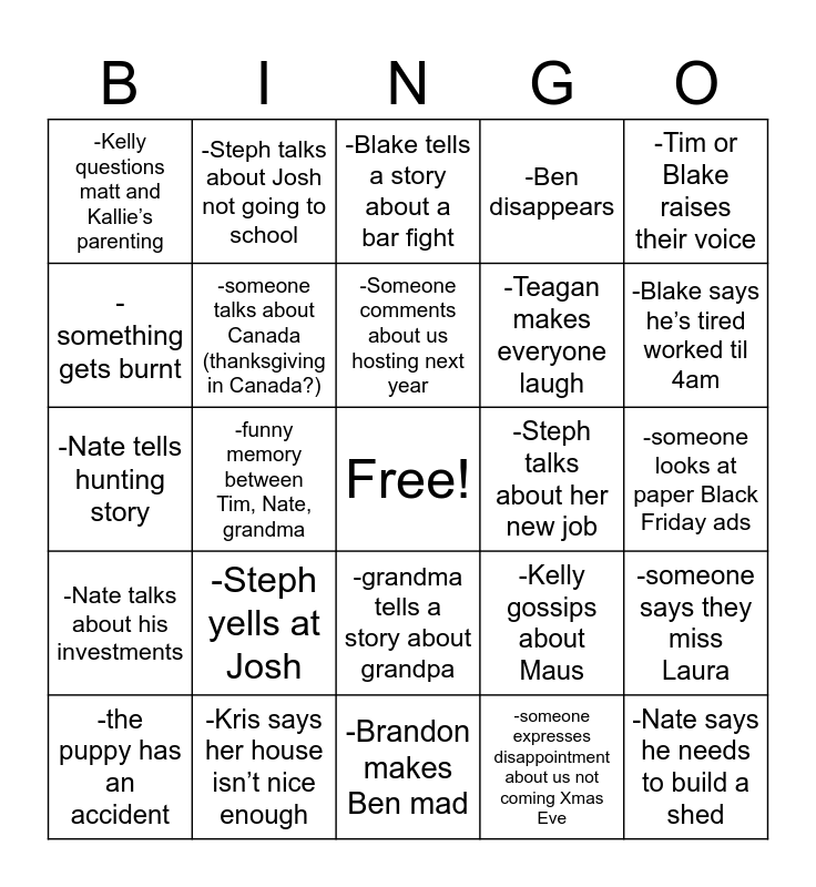 This bingo card has a free space and 24 words: -Steph yells at Josh, -Kris says her house isn’t nice enough, -Someone comments about us hosting next year, -the puppy has an accident, -Tim or Blake raises their voice, -Kelly questions matt and Kallie’s parenting, -something gets burnt, -Steph talks about Josh not going to school, -Steph talks about her new job, -grandma tells a story about grandpa, -Teagan makes everyone laugh, -Nate tells hunting story, -Kelly gossips about Maus, -someone says they miss Laura, -someone talks about Canada (thanksgiving in Canada?), -someone expresses disappointment about us not coming Xmas Eve, -someone looks at paper Black Friday ads, -Blake tells a story about a bar fight, -Blake says he’s tired worked til 4am, -funny memory between Tim, Nate, grandma, -Nate says he needs to build a shed, -Nate talks about his investments, -Ben disappears and -Brandon makes Ben mad.