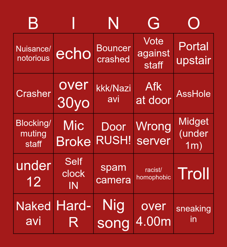This bingo card has a free space and 24 words: Self clock IN, Hard-R, kkk/Nazi avi, Naked avi, Portal upstair, Nuisance/ notorious, Crasher, echo, Wrong server, spam camera, Afk at door, Blocking/ muting staff, racist/ homophobic, Troll, over 30yo, over 4.00m, Midget (under 1m), Bouncer crashed, AssHole, Mic Broke, sneaking in, under 12, Vote against staff and Nig song.