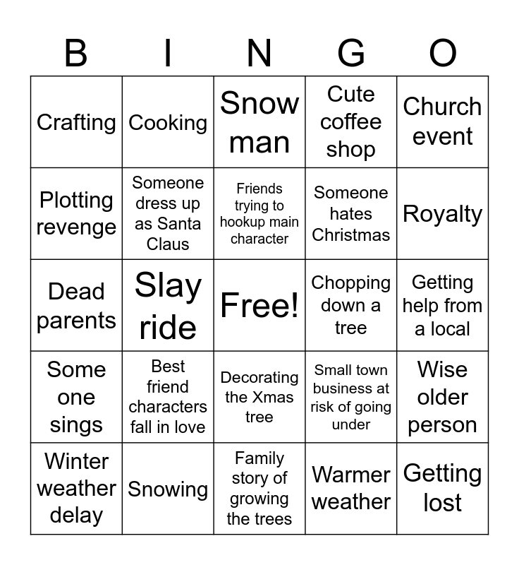 This bingo card has a free space and 30 words: Snowing, Snow ball fight, Slay ride, Skating, Crafting, Snow man, Someone dress up as Santa Claus, Decorating the Xmas tree, Chopping down a tree, Family story of growing the trees, Getting help from a local, Getting lost, Warmer weather, Coffee by the fireplace, Royalty, Gift swap, Small town business at risk of going under, Some one sings, Best friend characters fall in love, Church event, Dead parents, Some one recently died, Cooking, Someone hates Christmas, Plotting revenge, Cute coffee shop, Wise older person, Winter weather delay, Friends trying to hookup main character and Family pet.
