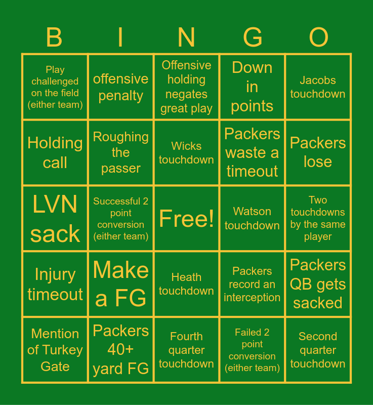 This bingo card has a free space and 52 words: First quarter touchdown, Second quarter touchdown, Third quarter touchdown, Fourth quarter touchdown, Make a FG, miss a FG, offensive penalty, Defensive penalty, Holding call, False start, Roughing the passer, Packers record a sack, Packers QB gets sacked, Packers record an interception, Packers QB gets intercepted, Reed touchdown, Wicks touchdown, Watson touchdown, Kraft touchdown, Jacobs touchdown, Successful 2 point conversion (either team), Failed 2 point conversion (either team), Play challenged on the field (either team), Packers waste a timeout, Packers fumble recovery, Bad call by ref, Goes for fourth down (either team), Packers win, Packers lose, Packers pick 6, Up in points, Down in points, Love Touchdown, Drop a wide open pass, McKinney interception, Offensive holding negates great play, Packers 40+ yard FG, Special teams touchdown, Packers receive ball at half, Packers start game with the ball, Gary sack, Two touchdowns by the same player, Injury timeout, Clark sack, Heath touchdown, Bo Melton big play, Nixon does something valuable, LVN sack, Whelan pins it within 5 yards, Wilson touchdown, Mention of Turkey Gate and JLove gets a turkey leg.