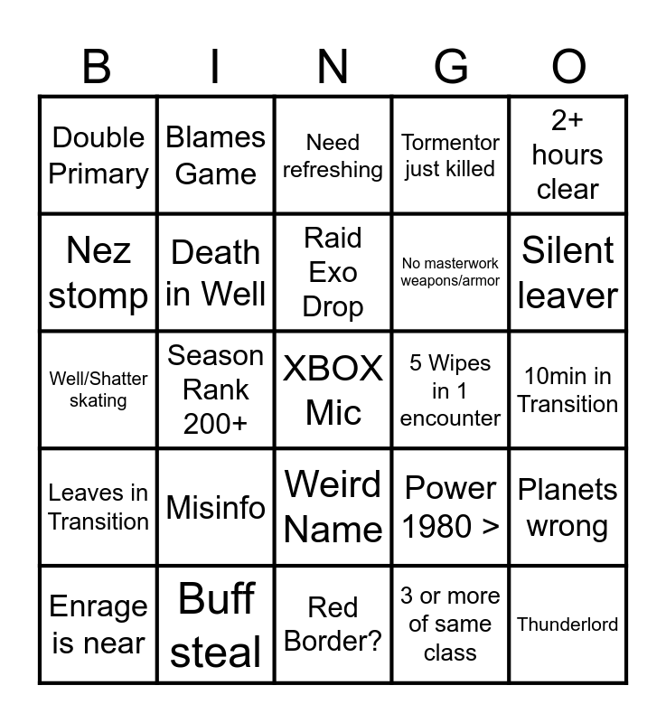 This bingo card has a free space and 24 words: Enrage is near, Misinfo, Raid Exo Drop, 3 or more of same class, 2+ hours clear, Double Primary, Blames Game, Need refreshing, 5 Wipes in 1 encounter, 10min in Transition, Well/Shatter skating, Death in Well, Power 1980 >, Planets wrong, Nez stomp, Buff steal, Red Border?, Tormentor just killed, Silent leaver, Leaves in Transition, Season Rank 200+, Weird Name, No masterwork weapons/armor and Thunderlord.
