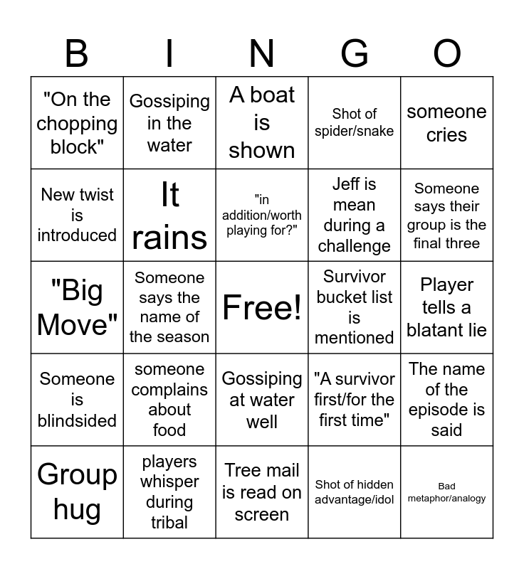 This bingo card has a free space and 24 words: someone complains about food, players whisper during tribal, "in addition/worth playing for?", Group hug, someone cries, "On the chopping block", New twist is introduced, Gossiping in the water, Survivor bucket list is mentioned, Gossiping at water well, Jeff is mean during a challenge, "Big Move", "A survivor first/for the first time", The name of the episode is said, It rains, Shot of hidden advantage/idol, Player tells a blatant lie, A boat is shown, Someone says their group is the final three, Someone says the name of the season, Bad metaphor/analogy, Someone is blindsided, Shot of spider/snake and Tree mail is read on screen.