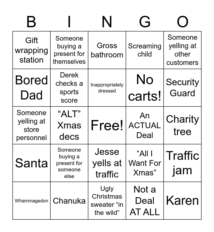 This bingo card has a free space and 35 words: The Law, Kaitlyn can’t make a decision, Madison is so over it, Derek checks a sports score, Jesse yells at traffic, Screaming child, Bored Dad, Parking lot antics, Inappropriately dressed, Stroller laden with shopping bags, Someone yelling at store personnel, Someone yelling at other customers, Salvation Army Donations, Someone helping someone else, Gift wrapping station, An ACTUAL Deal, Not a Deal AT ALL, “ALT” Xmas decs, Santa, Karen, “All I Want For Xmas”, Whammagedon, Traffic jam, Chanuka, Gross bathroom, Security Guard, Long checkout line, Price tag missing, No carts!, Charity tree, Friendly greeter, Ugly Christmas sweater “in the wild”, Someone buying a present for someone else, Someone buying a present for themselves and Dog in a bag.