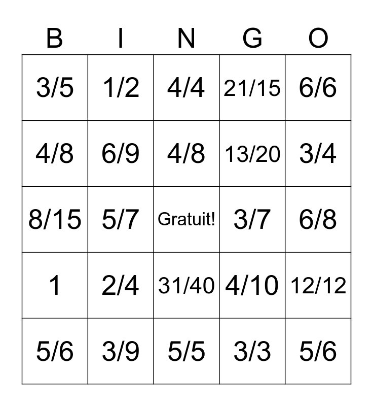 This bingo card has a free space and 24 words: 5/6, 2/4, 4/8, 3/3, 6/6, 3/5, 1/2, 4/4, 3/7, 6/8, 8/15, 6/9, 4/10, 12/12, 4/8, 3/9, 5/5, 21/15, 3/4, 1, 5/7, 31/40, 13/20 and 5/6.