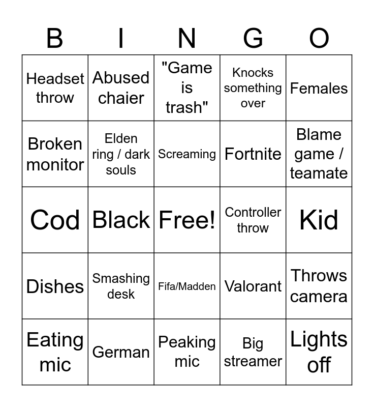 This bingo card has a free space and 24 words: Smashing desk, German, Screaming, Eating mic, Females, Headset throw, Broken monitor, Abused chaier, Controller throw, Fifa/Madden, Fortnite, Cod, Valorant, Throws camera, Elden ring / dark souls, Big streamer, Kid, "Game is trash", Blame game / teamate, Black, Lights off, Dishes, Knocks something over and Peaking mic.