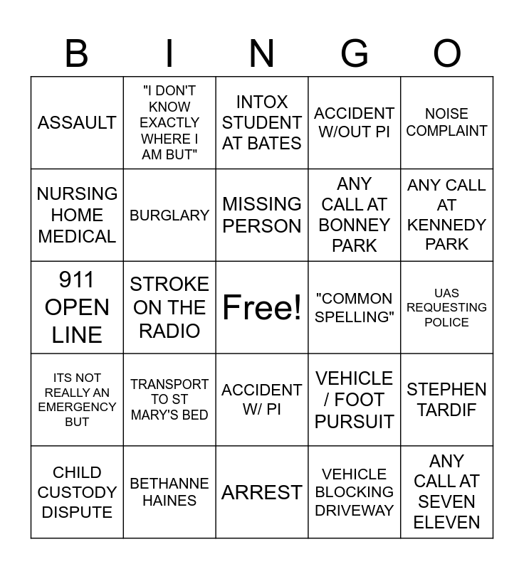 This bingo card has a free space and 35 words: "SLUMPED OVER", 10-80, SHOTS FIRED / FIREWORKS, BURGLARY, ACCIDENT W/ PI, ACCIDENT W/OUT PI, NURSING HOME MEDICAL, OUI, MISSING PERSON, OD, 911 OPEN LINE, NOISE COMPLAINT, 10-44 CALLER, "I USED TO BE A POLICE OFFICER", ASSAULT, "COMMON SPELLING", VEHICLE BLOCKING DRIVEWAY, STROKE ON THE RADIO, ITS NOT REALLY AN EMERGENCY BUT, ANY CALL AT SEVEN ELEVEN, VEHICLE / FOOT PURSUIT, CHILD CUSTODY DISPUTE, STEPHEN TARDIF, BETHANNE HAINES, INTOX STUDENT AT BATES, ANY CALL AT KENNEDY PARK, "CAN YOU TELL ME IF I HAVE A WARRANT", "I LOCKED MYSELF OUT OF MY CAR/HOUSE", ANY CALL AT BONNEY PARK, UAS REQUESTING POLICE, CHILDREN TROUBLES, ARREST, TRANSPORT TO ST MARY'S BED, "I DON'T KNOW EXACTLY WHERE I AM BUT" and "CALLER DISCONNECTED".
