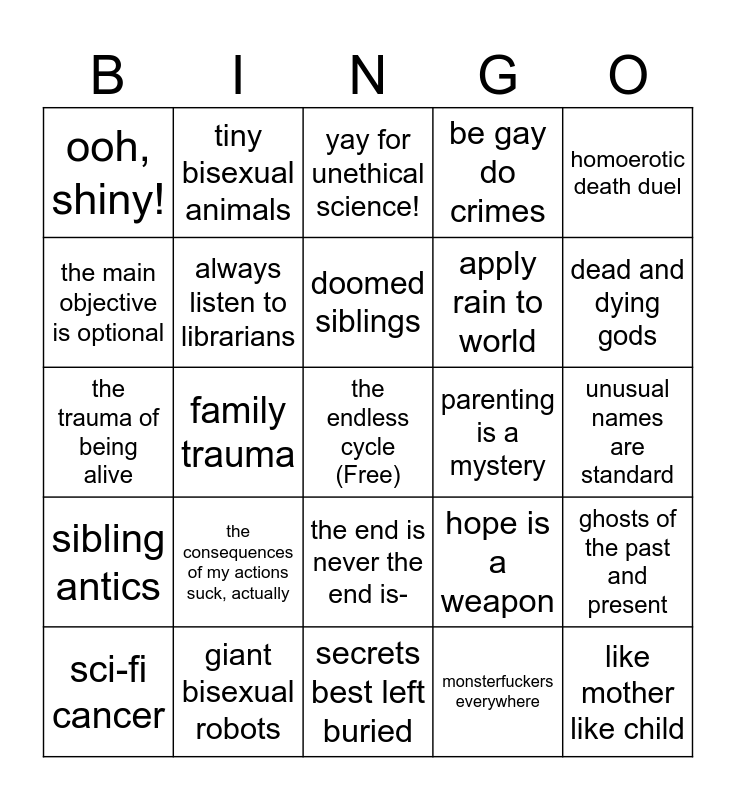This bingo card has a free space and 24 words: the consequences of my actions suck, actually, giant bisexual robots, doomed siblings, sci-fi cancer, homoerotic death duel, ooh, shiny!, the main objective is optional, tiny bisexual animals, parenting is a mystery, the end is never the end is-, apply rain to world, the trauma of being alive, hope is a weapon, ghosts of the past and present, always listen to librarians, monsterfuckers everywhere, unusual names are standard, yay for unethical science!, dead and dying gods, family trauma, like mother like child, sibling antics, be gay do crimes and secrets best left buried.
