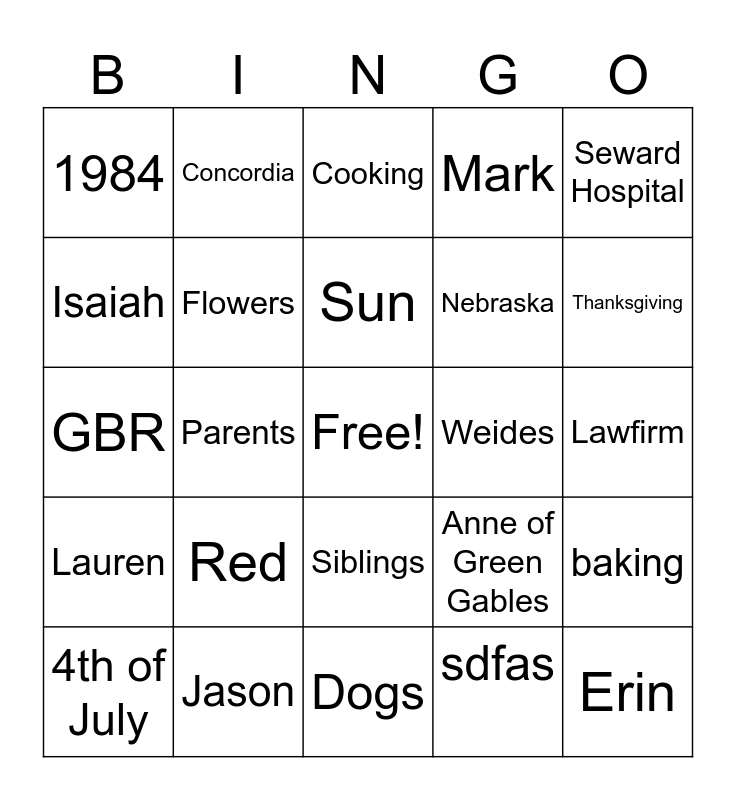 This bingo card has a free space and 25 words: Red, Dogs, Sun, 4th of July, Seward Hospital, 1984, Isaiah, Concordia, Weides, Siblings, Nebraska, GBR, Anne of Green Gables, baking, Flowers, December, Lawfirm, Cooking, Thanksgiving, Parents, Erin, Jason, Lauren, Mark and sdfas.