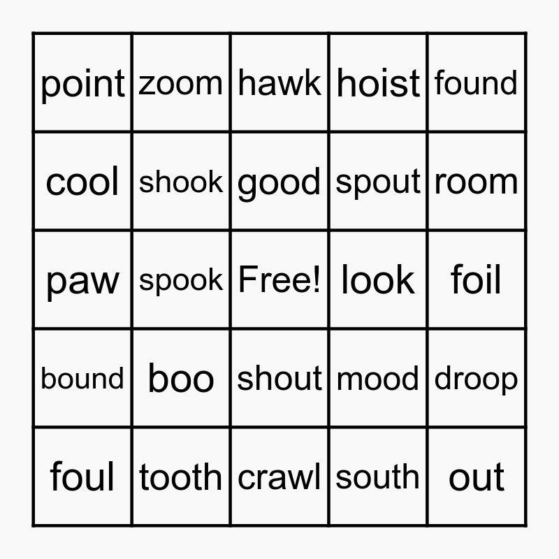 This bingo card has a free space and 24 words: boo, tooth, good, foul, found, point, cool, zoom, look, shout, spout, paw, mood, droop, shook, south, foil, hawk, room, spook, out, bound, hoist and crawl.