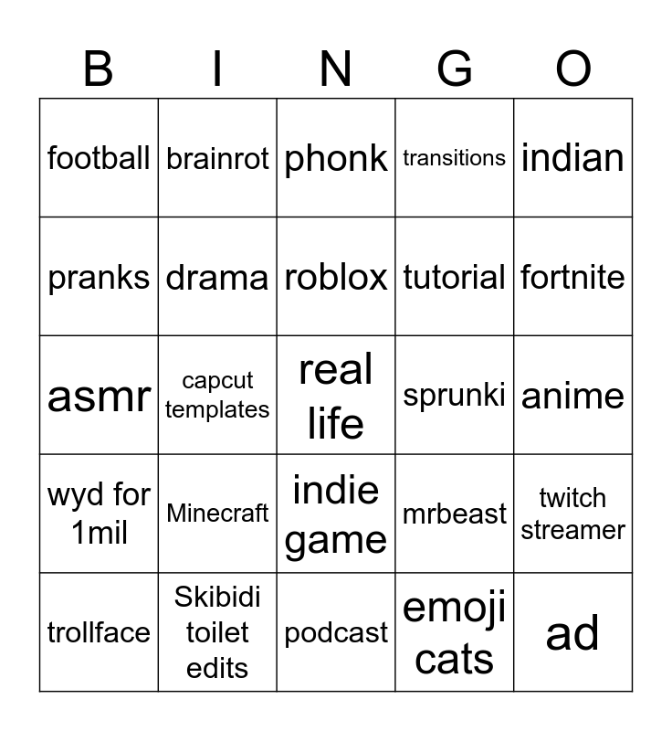 This bingo card has a free space and 24 words: Minecraft, Skibidi toilet edits, roblox, trollface, indian, football, pranks, brainrot, sprunki, indie game, tutorial, asmr, mrbeast, twitch streamer, drama, emoji cats, anime, phonk, fortnite, capcut templates, ad, wyd for 1mil, transitions and podcast.