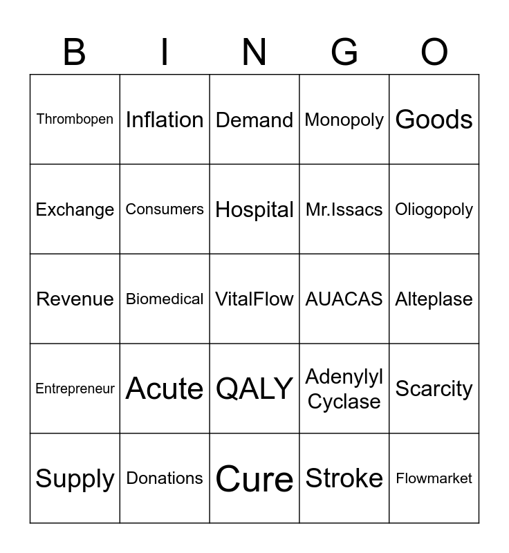 This bingo card has a free space and 24 words: Acute, Donations, Hospital, Supply, Goods, Thrombopen, Exchange, Inflation, AUACAS, QALY, Mr.Issacs, Revenue, Adenylyl Cyclase, Scarcity, Consumers, Stroke, Alteplase, Demand, Oliogopoly, Biomedical, Flowmarket, Entrepreneur, Monopoly and Cure.