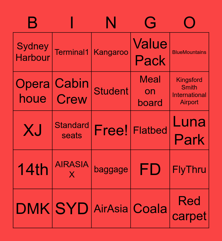 This bingo card has a free space and 24 words: AIRASIA X, SYD, Student, DMK, BlueMountains, Sydney Harbour, Opera houe, Terminal1, Flatbed, baggage, Meal on board, XJ, FD, FlyThru, Cabin Crew, Coala, Luna Park, Kangaroo, Kingsford Smith International Airport, Standard seats, Red carpet, 14th, Value Pack and AirAsia.
