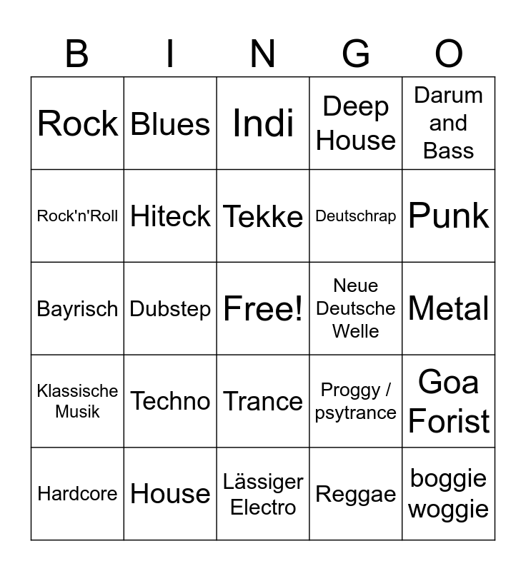 This bingo card has a free space and 24 words: Techno, House, Tekke, Hardcore, Darum and Bass, Rock, Rock'n'Roll, Blues, Neue Deutsche Welle, Trance, Deutschrap, Bayrisch, Proggy / psytrance, Goa Forist, Hiteck, Reggae, Metal, Indi, Punk, Dubstep, boggie woggie, Klassische Musik, Deep House and Lässiger Electro.