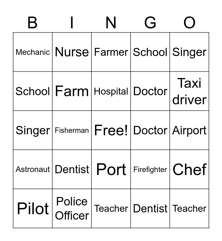 This bingo card has a free space and 24 words: Dentist, Police Officer, Hospital, Pilot, Singer, Mechanic, School, Nurse, Doctor, Port, Doctor, Singer, Firefighter, Chef, Farm, Dentist, Airport, Farmer, Taxi driver, Fisherman, Teacher, Astronaut, School and Teacher.