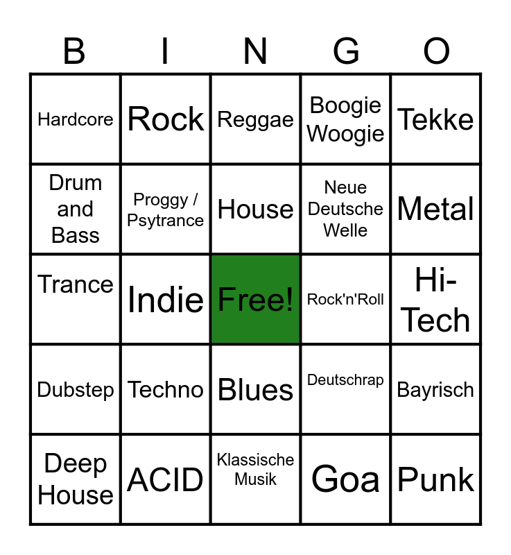 This bingo card has a free space and 24 words: Techno, ACID, House, Deep House, Tekke, Hardcore, Drum and Bass, Rock, Rock'n'Roll, Blues, Neue Deutsche Welle, Trance, Deutschrap, Bayrisch, Proggy / Psytrance, Goa, Hi-Tech, Reggae, Metal, Indie, Punk, Dubstep, Boogie Woogie and Klassische Musik.