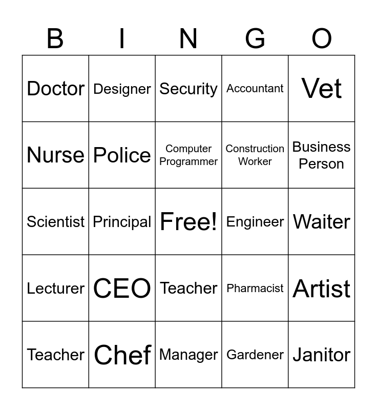 This bingo card has a free space and 24 words: CEO, Chef, Computer Programmer, Teacher, Vet, Doctor, Nurse, Designer, Engineer, Teacher, Construction Worker, Scientist, Pharmacist, Artist, Police, Gardener, Waiter, Security, Business Person, Principal, Janitor, Lecturer, Accountant and Manager.