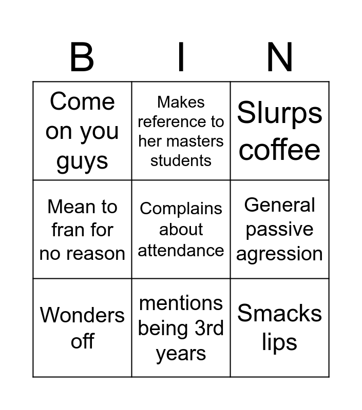 This bingo card has 9 words: Wonders off, Slurps coffee, Makes reference to her masters students, Mean to fran for no reason, Come on you guys, General passive agression, Complains about attendance, Smacks lips and mentions being 3rd years.